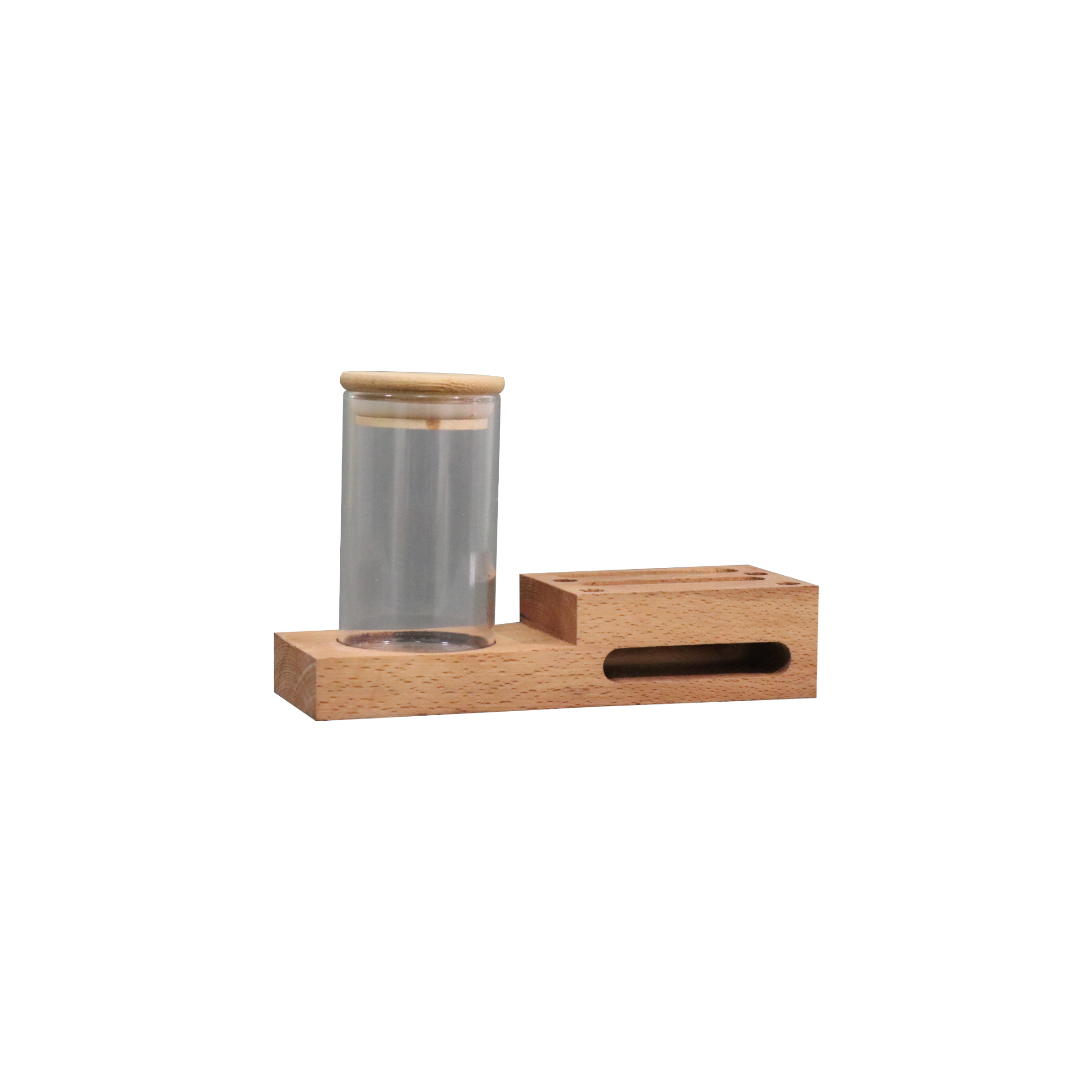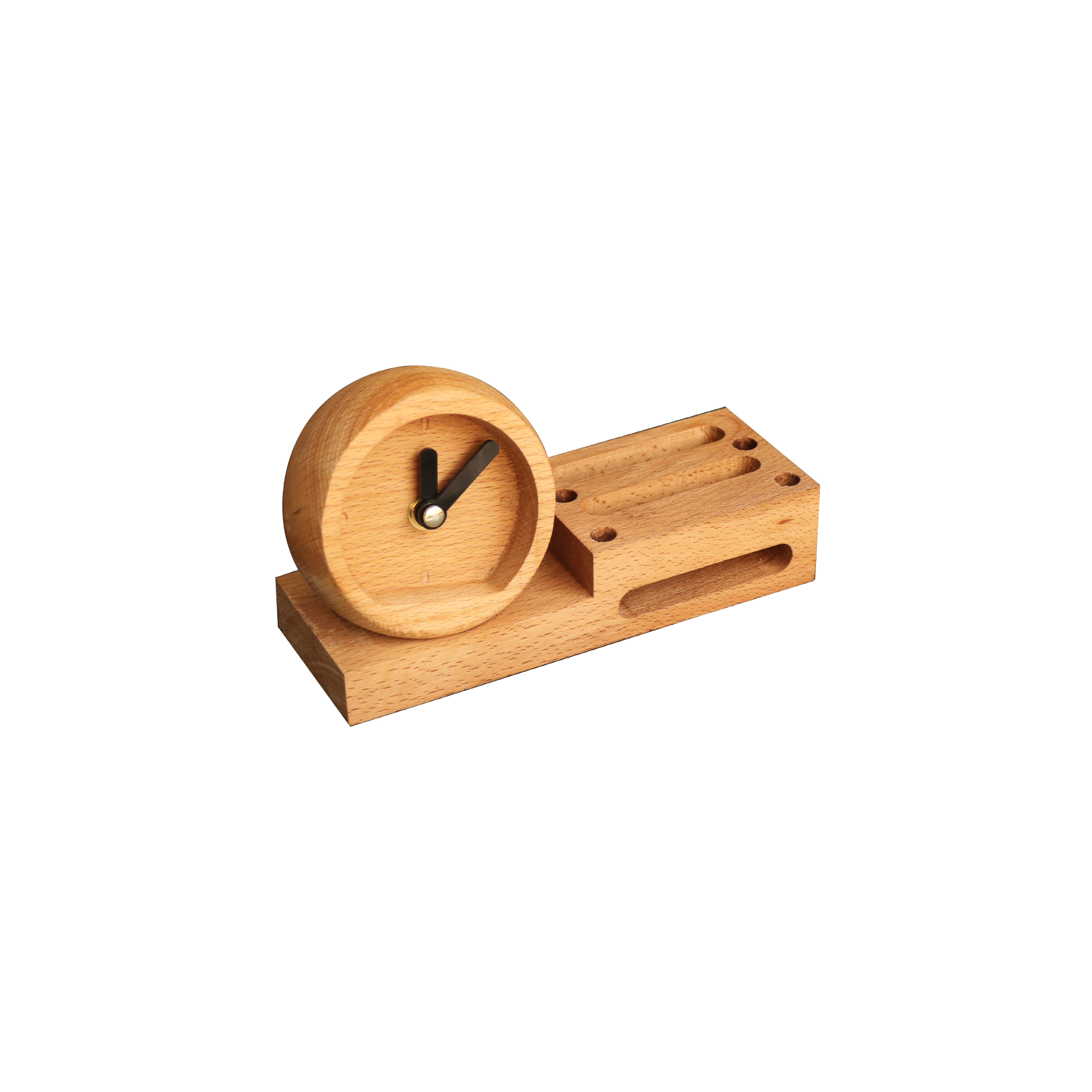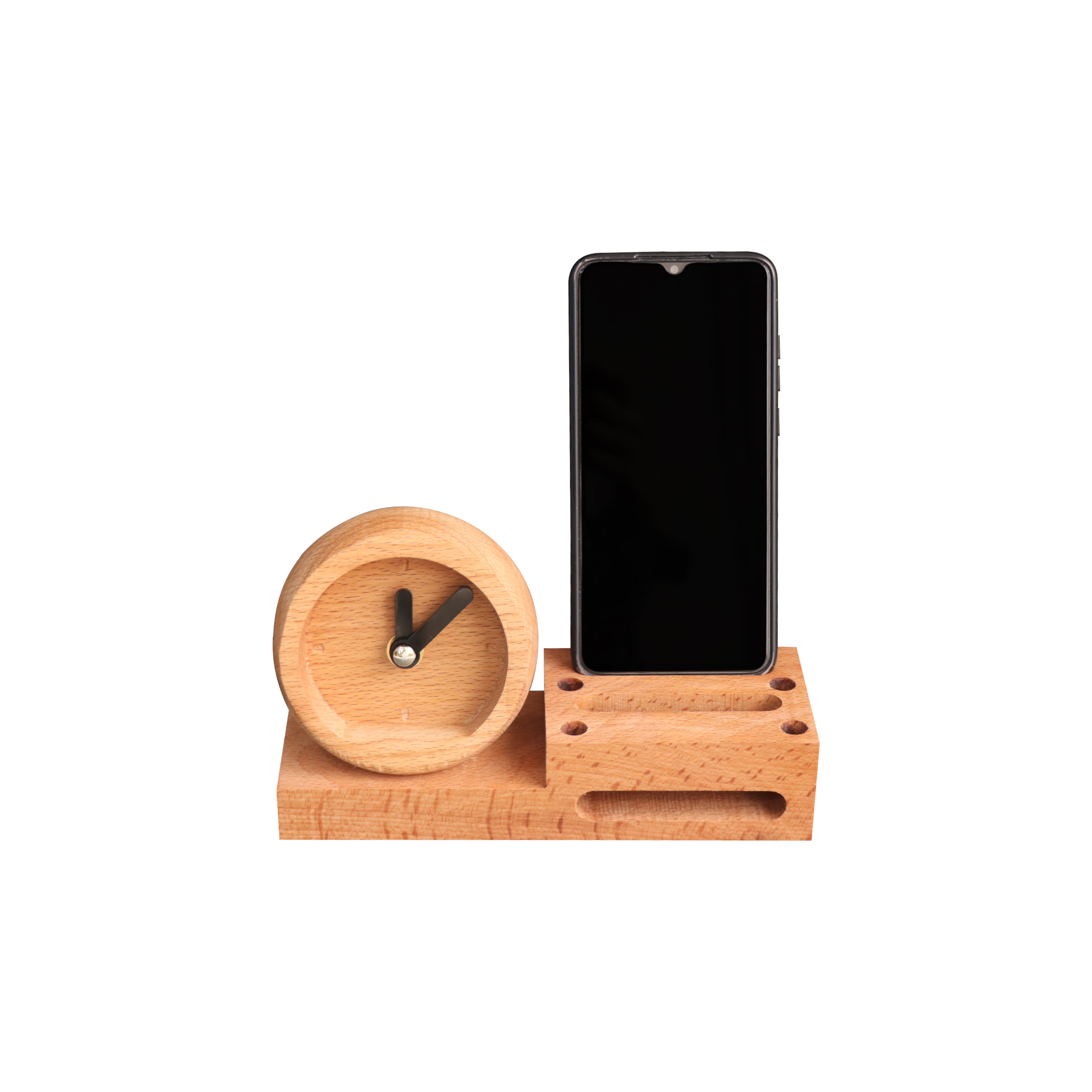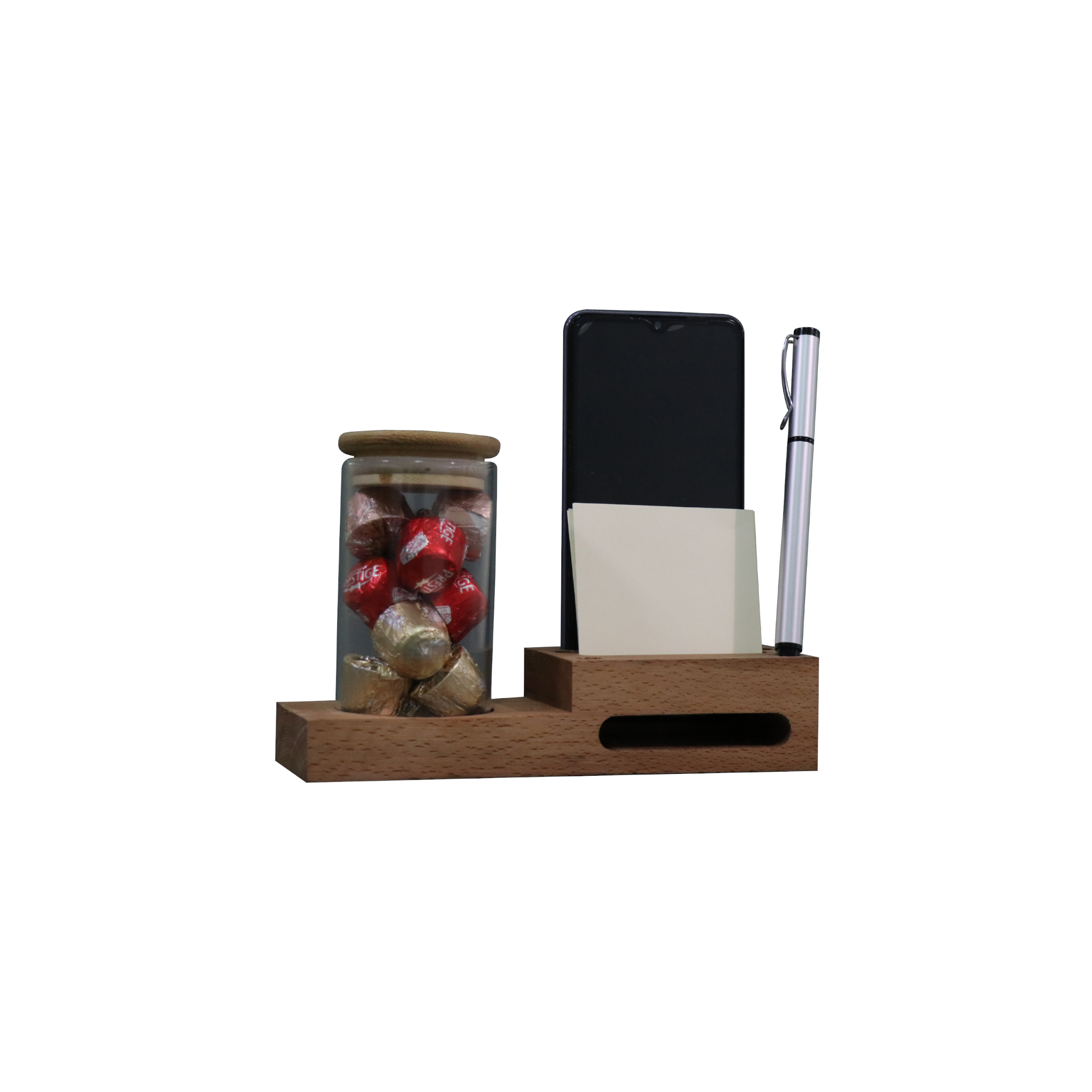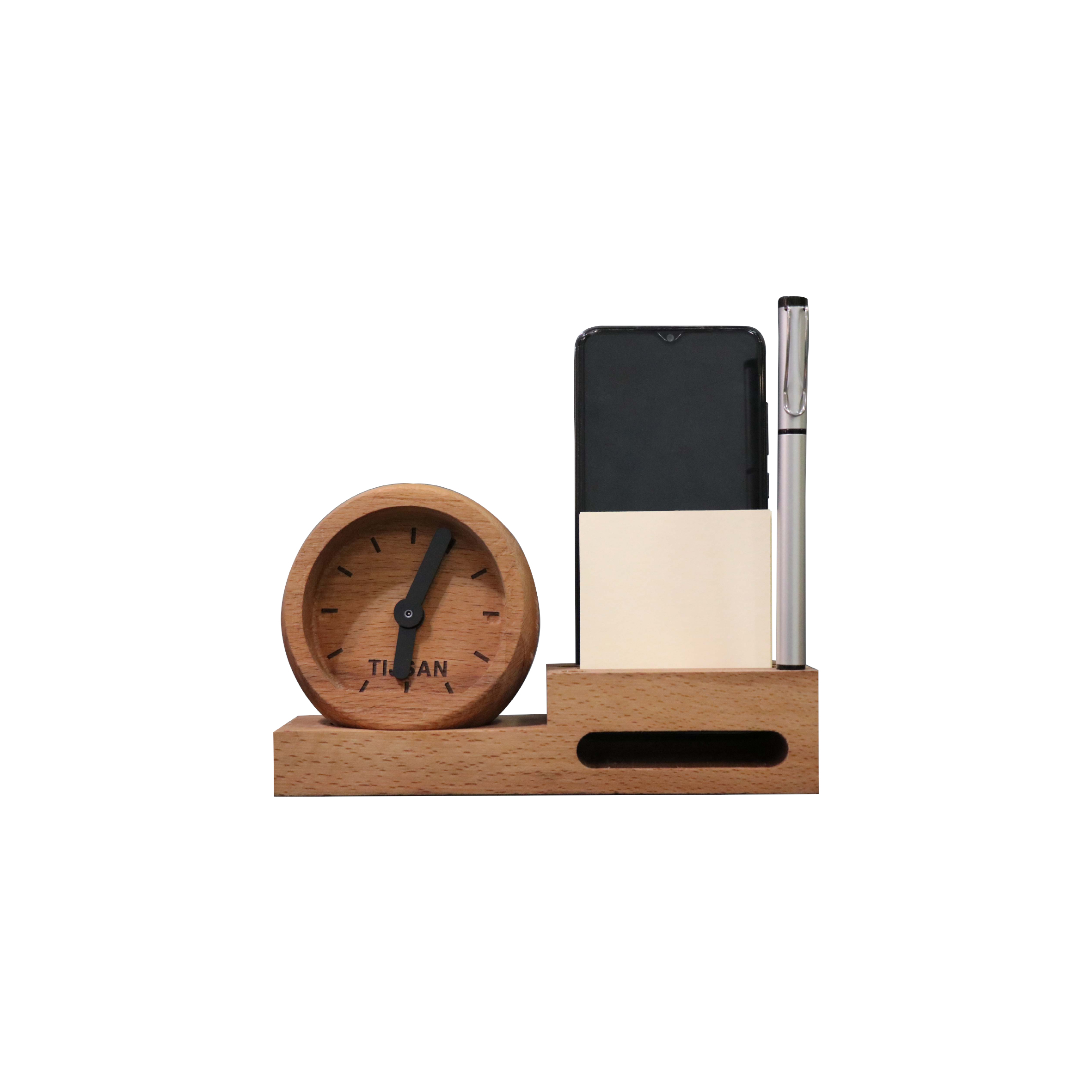 رومیزی چندکاره چوبی تیج سان با قابلیت های مختلف مانند جای کاغذ یادداشت،دو مدل ساعت با قابلیت سفارشی سازی،اسپیکر و یک شیشه